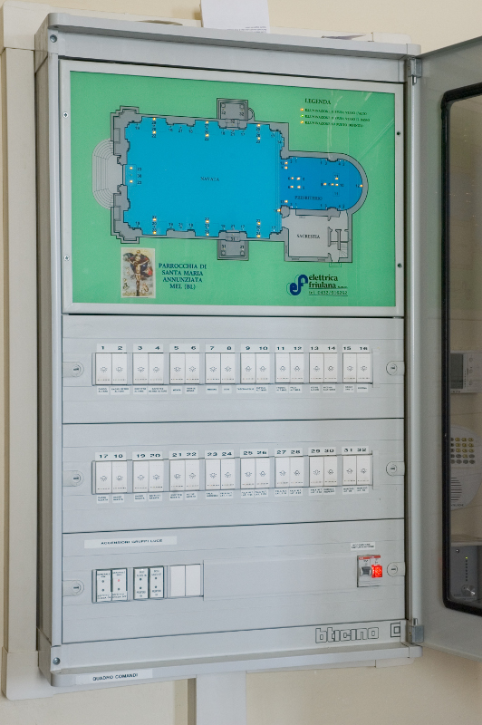 A Mel, paese della Valbelluna, sorge la chiesa di S. Maria Annunziata, ricca di opere dell’artista Giovanni de Min, già allievo del Canova. Dopo aver analizzato e studiato l’ ambiente, abbiamo realizzato un impianto illuminotecnico con caratteristiche spettrali adatte a valorizzare le peculiarità cromatiche degli spazi e del patrimonio artistico. La capacità di mantenere un ottima stabilità del flusso luminoso e cromatico nel tempo consente la giusta messa in risalto delle opere, ed assolve al compito di mettere la testimonianza artistica al servizio della preghiera. Il quadro accensioni permette, mediante la gestione del sistema BUS, di effettuare le operazioni di accensione e spegnimento luci di ogni singola zona. Il pannello sinottico rende visibile in tempo reale lo stato delle varie accensioni.